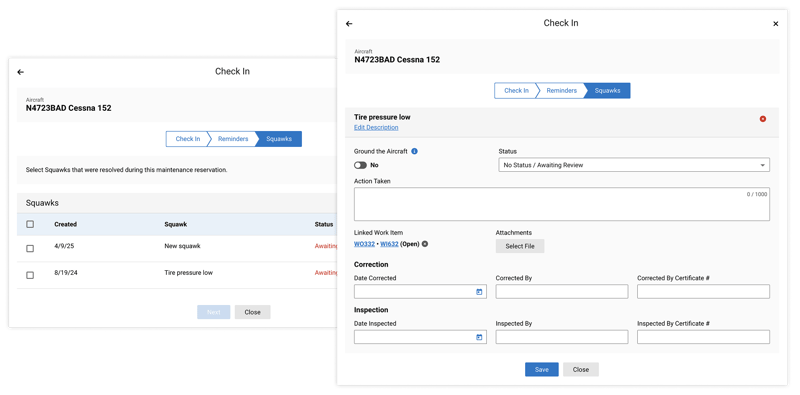 The Return to Service update makes managing maintenance events more efficient by consolidating reminders and squawks into one unified workflow, eliminating the need to toggle between systems. Using tach/meter time entered at check-in, you can now: